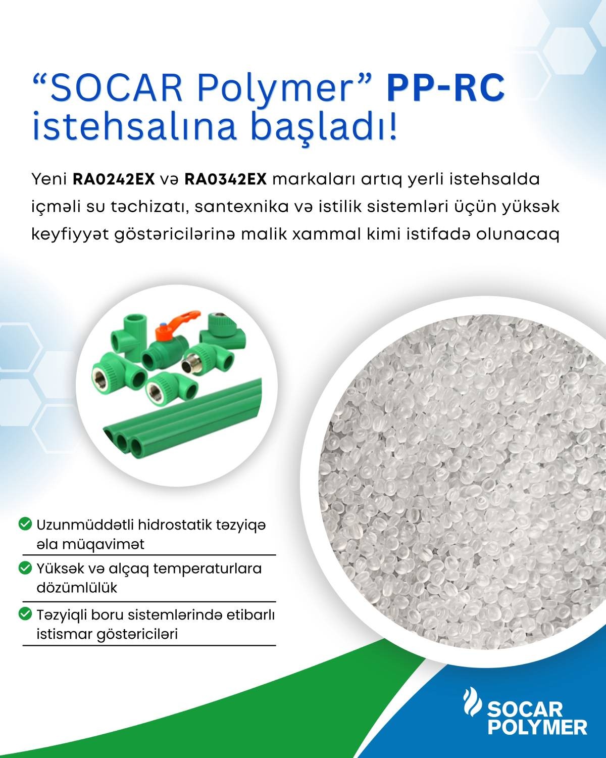 Сегодня мы с гордостью представляем важную инновацию для национальной полимерной и трубной промышленности Азербайджана - компания «SOCAR Polymer» официально запустила местное производство марок PP-RC, применяемых в системах питьевого водоснабжения, сантехники, отопления и охлаждения. Благодаря производству марок RA0242EX и RA0342EX, местные производители труб различного назначения могут теперь заменить импортируемое сырье качественными отечественными аналогами.